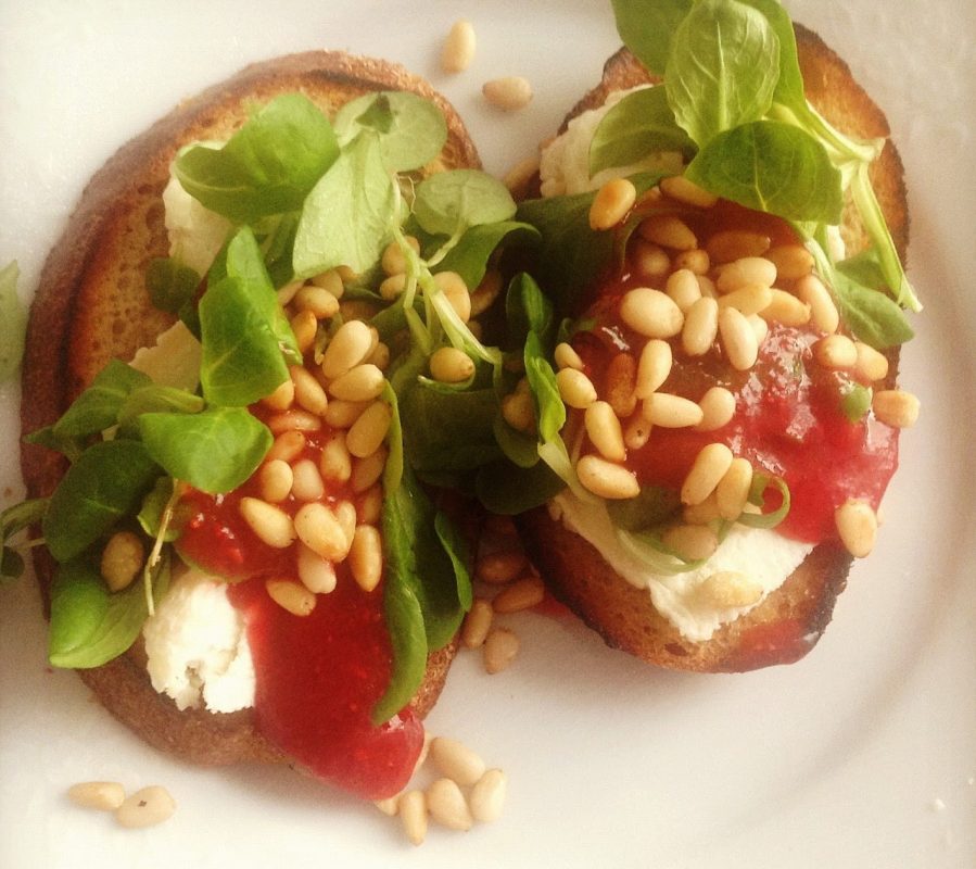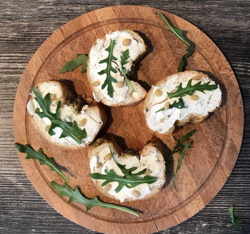 Bruschetta with curd cheese, arugula and pine nuts